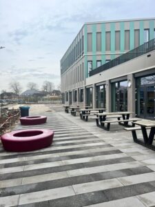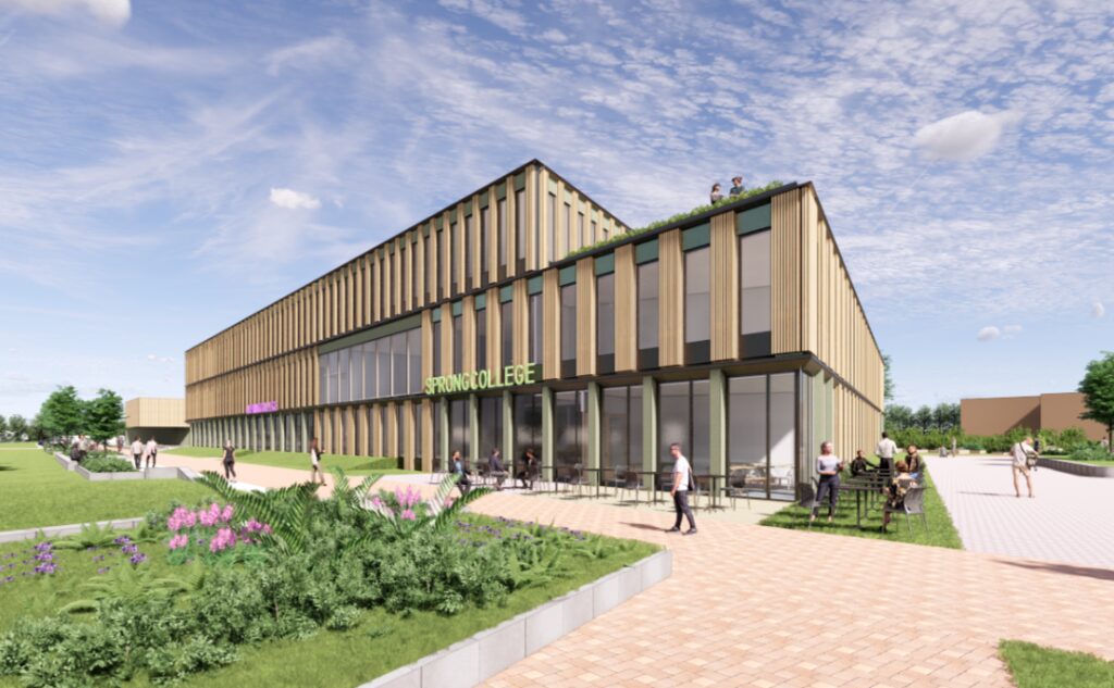 Onderwijsgebouw ten behoeve van voortgezet onderwijs. Een gebouw van ca 5500m2 BVO verdeeld over drie bouwlagen, met twee ingangen. Één voor alfrinkcollege en één voor sprongcollege.