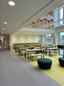 Verbouw en deel nieuwbouw, met gescheiden aula's voor boven en onderbouw, die beide centraal liggen in het gebouw met rondom de lokalen.